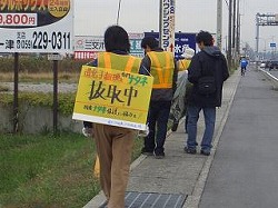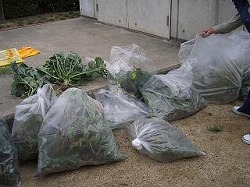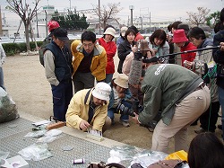 当日は『中部の会』で募った市民約50名が三重県白子駅前の公園に集合。作業の方法、セイヨウナタネの見分け方などの説明のあと、各々4〜5名の10グループに別れ、全行程40キロのうち今回は20キロを分担して抜取り作業を行ないました。 |