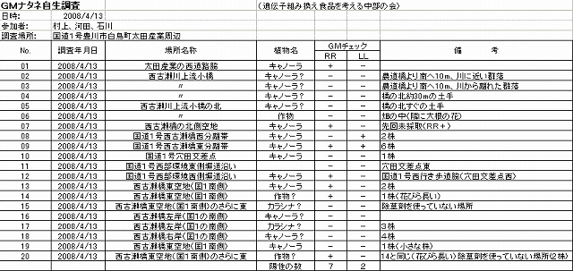 西古瀬川流域の在来ナタネとカラシナの群生。さらにセイヨウナタネの自生という状況から、特に西古瀬川周辺を再調査しました。 かつて豊川市では在来ナタネの栽培がさかんで、春になると一面ナタネ畑であったそうです。今では栽培されることがなくなりましたが、その名残か、多くの河川敷で野生化したたくさんの在来ナタネが確認されます。 No.02〜06はいずれも在来ナタネ。ところどころにカラシナも混じる。今回の調査での最重要点はなんといっても、在来ナタネと思われる株(No.14)にRR耐性GMを確認したことです。現時点でははっきりしたことはわかりませんが、GMセイヨウナタネとの交雑種の可能性が否めません(現在米国アイオワ州立大学に同定を依頼中)。 ![]() 一般的に在来ナタネ(brassica rapa)とセイヨウナタネ(brassica naps)は交雑率数%と低く、仮に交雑が起こってもその種子の発芽率も低いため、自然界で拡散する恐れは少ないとされています。しかしながら、セイヨウナタネのGM遺伝子が交雑により在来ナタネに入り込み、在来ナタネと交雑を重ねた場合(戻し交配:固定品種を作る場合の交配技術でごく一般的)、GM在来ナタネとなります。その結果は雑草化ということになってしまい、根絶は難しくなってしまいます。 GMナタネが自然界にあたえる影響について、まだ何もわかっていません。今回の在来ナタネとの交雑の可能性は、大きな危惧をはらんでいるといっても過言ではありません。 |