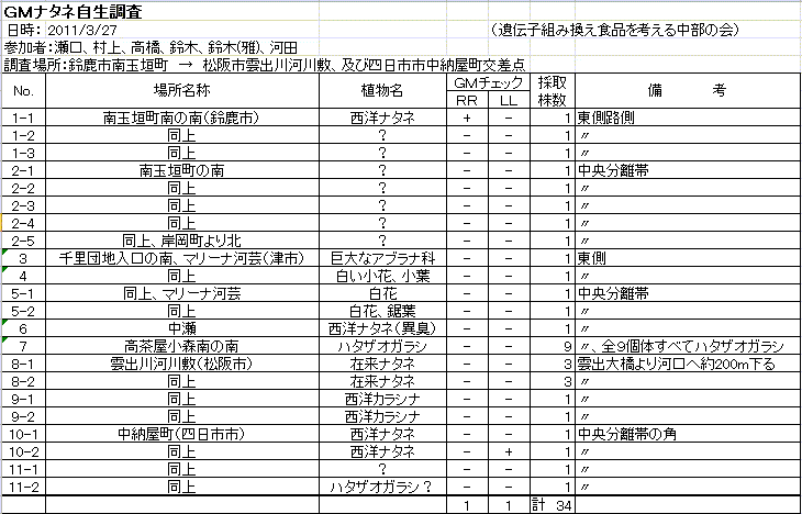 下の表に示したとおり、セイヨウナタネではないと思われるアブラナ科の個体では、GM反応を示したものはありませんでした。