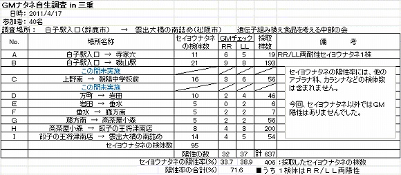 セイヨウナタネの陽性率は除草剤ラウンドアップ耐性(RR)が33.7%、バスタ耐性(LL)が38.9%でした。両方を合わせた陽性率は71.6%(両方に耐性の個体が1株)でした。