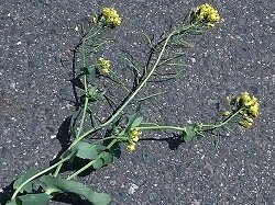 左はハタザオガラシ(5月撮影)。特徴はセイヨウナタネと比べて花が小型。種子鞘は細く長い。
