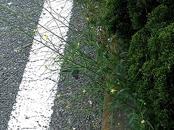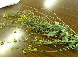今回の抜取隊でも、雑種とみられるナタネが9個体確認されました。右の写真が通常のセイヨウナタネです。花を咲かせた後、種子鞘が適当な長さに成長しています。