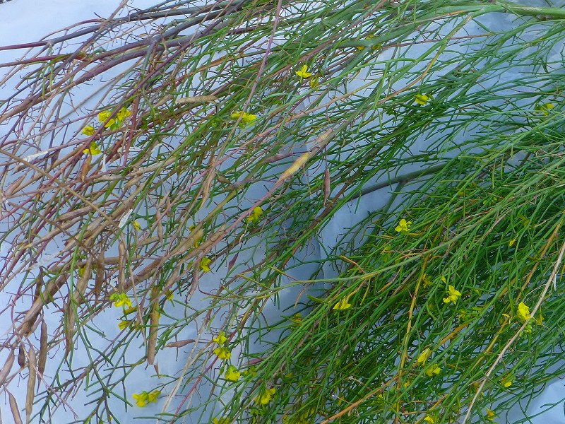 ハタザオガラシとの雑種?の場合、種鞘は種子が稔りにくいが(右の枝の鞘と比較してください)、左の枝の多くの種鞘には種子がたわわに稔っている。 検体No.B-23(LL陽性)