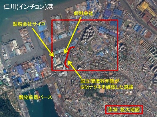 遺伝子組換え食品を考える中部の会では、2014年10/1、独自にソウルの南に位置する仁川(インチョン)港の該当する地区の調査を行いました。 |