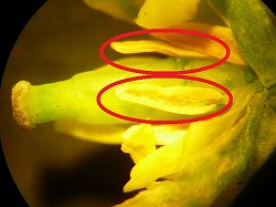 上、二枚の顕微鏡写真参照。左は雑種?で、花芯に花粉が見当たりません。右の写真(セイヨウナタネ)では、たっぷりの花粉が確認できます。
