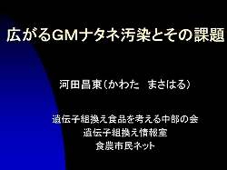 さらに、参加者のみなさまに、GMセイヨウナタネの自生について理解を深めていただけるよう、河田昌東さんのミニ講演『広がる遺伝子汚染とその課題』を行いました。