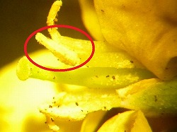 正常なセイヨウナタネの花芯。雄蕊の葯が膨らんでいて花粉が散っている