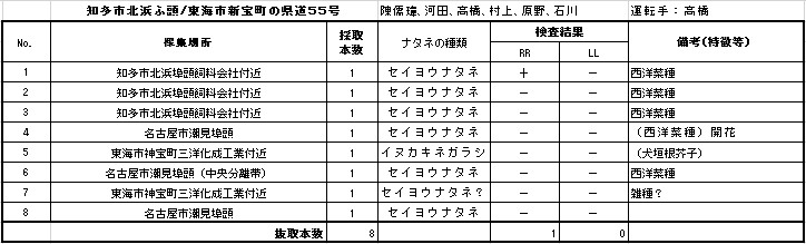 今回も東海市神宝町三洋化成工業付近で、雑種を思わせるナタネを確認しました(検体Nо.7GM陰性)。このポイント付近では、