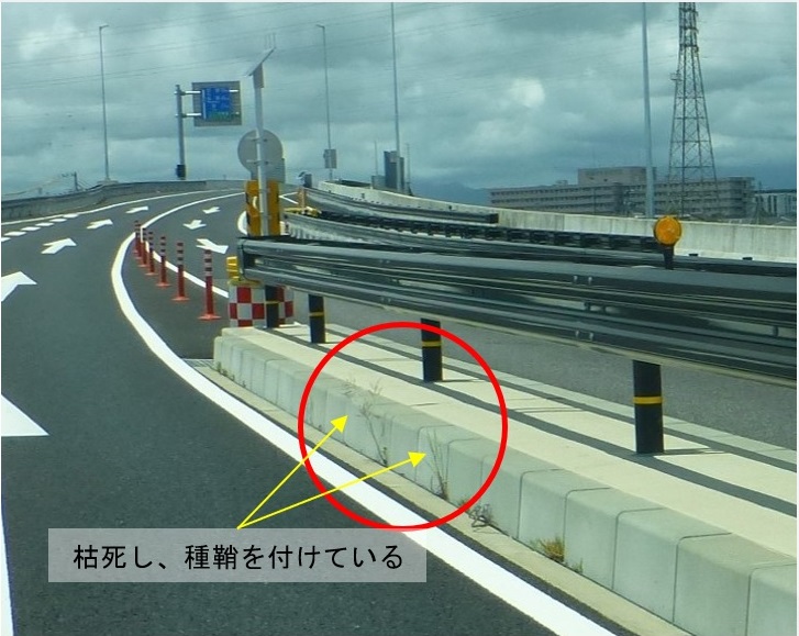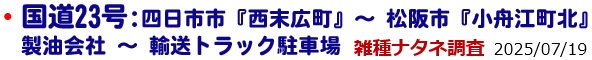 走行する車中からの目視による確認では限界があるものの、今夏の猛暑の影響か、セイヨウナタネの自生は極端に少なく、国道23号沿いではサンプリングすることができませんでした。