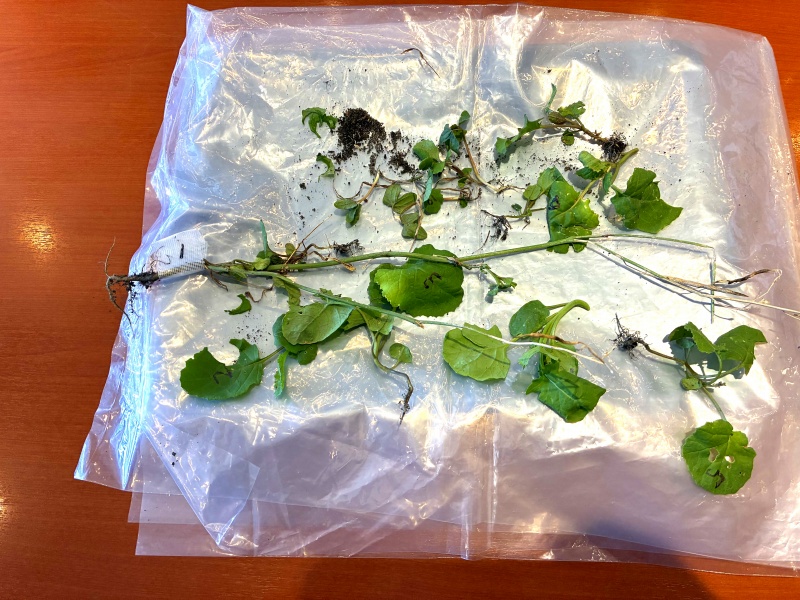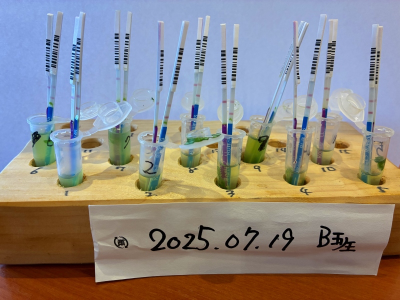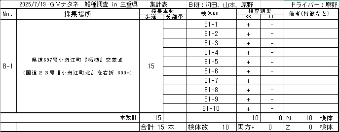 松阪市の国道23号『小舟江町北』から関連製油会社へ向かう県道697号『柘植』交差点付近で15本のセイヨウナタネの群落を確認し採取。うち10本について、試験紙による簡易検査を行った結果、すべての個体についてRR陽性(除草剤ラウンドアップ耐性)であることを確認しました。