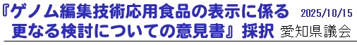 愛知県からも『ゲノム編集技術応用食品の表示に係る更なる検討についての意見書 』が、令和7年10月15日、愛知県議会で採択されました。 政木りか議員(自由民主党愛知県議員団総務会長・名古屋市東区)、藤原ひろき議員(豊川市)、山本浩史議員(田原市)、石井芳樹議員(長久手市)、渥美フーズ渡会一仁社長ほか、みなさまの連携・ご協力のおかげとお礼いたします。 全国の自治体からの意見書採択、これからも継続されることを望みます。 食品への必要かつ不可欠な情報として、その表示制度は、消費者にとって最小限の必須事項です。 みなさま、どうもありがとうございました! 『ゲノム編集技術応用食品の表示に係る更なる検討についての意見書 』: https://www.pref.aichi.jp/uploaded/attachment/586321.pdf 愛知県議会HP「令和7年9月定例議会意見書」: https://www.pref.aichi.jp/site/gikai/ikensho0709.html より参照 |