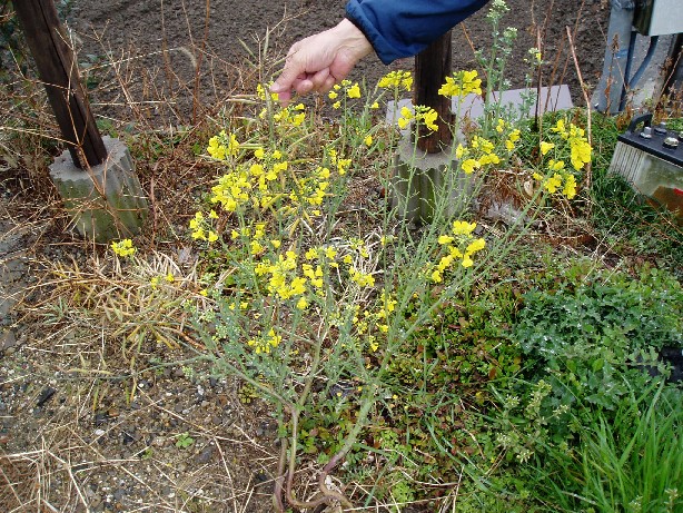 国道23号沿線にある民家の庭。1年以上枯れずに居座っているGMナタネ。