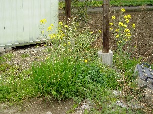 度重なる除草剤の施用でGMナタネだけが居残り巨大化。写真のように茎は3cmほどにも成長、まわりに自分の子孫をまき散らしています。 |