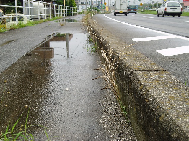 鈴鹿市国崎町の国道23号線西行き道路脇で種子をまき散らしているセイヨウナタネ。道路の縁石に沿って延々と連なっている。梅雨時ということもあり、落ちた種子は時を待たず発芽する。