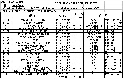 2008/06/14、遺伝子組み換え食品を考える中部の会は『GMナタネ自生調査全国報告集会』第2日目のGMナタネ抜取隊に向けての下見調査を行いました。