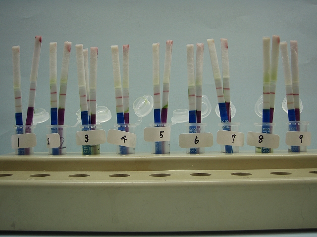 検査の結果。発現した陽性を示すラインの濃淡があることに気付く。今まで見過ごしてきたが、もしかするとそれぞれの個体に発現されているRR耐性遺伝子のタンパク質の量に違いによるものなのかもしれない(試験紙の特性、誤差によるものかもしれない)。どの程度で陽性と判断すべきかむつかしい。紛らわしい場合は『擬陽性』と表現するしかないのかもしれない。