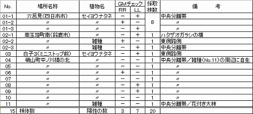 左の表の中で、No.02-2、02-3、11がハタザオガラシとの交雑種と思われる3個体。試験紙による簡易検査では、
