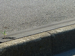 街路樹が取り除かれ、新たにコンクリート被覆が施されている。縁石と舗装のすき間にナタネが‥