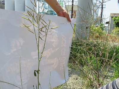 5/5、その後の状況確認の為に現場に出向き、写真撮影し、セイヨウナタネとハタザオガラシの種子を採取し、セイヨウナタネのGM検査を実施しました。セイヨウナタネは@バスタ(LL)+、Aラウンドアップ(RR)+でした。