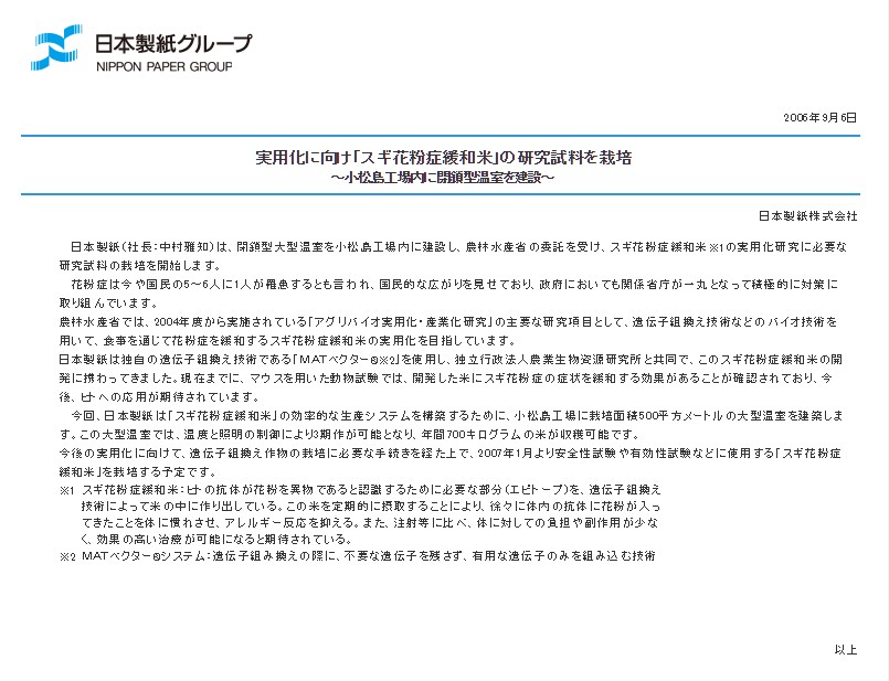 2004年からJA全農と農水省農業生物資源研究所の共同研究ということで始められた『スギ花粉症緩和米』だが、2006年、民間の日本製紙に回されることとなった