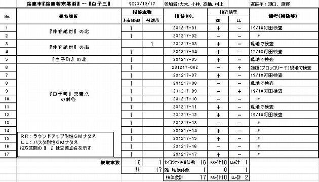 今回の調査では、とくに『体育館前』と『白子町』〜『白子駅入口』周辺で、雑種とみられる1個体を含め、計17検体のナタネを採取しました。
