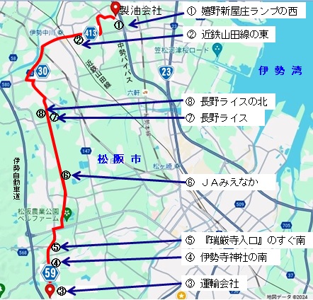 嬉野新屋庄ランプの西(製油所の東) | 近鉄山田線の東 | 運輸会社の駐車場(松阪市伊勢寺町) | JAみえなかライスセンター |