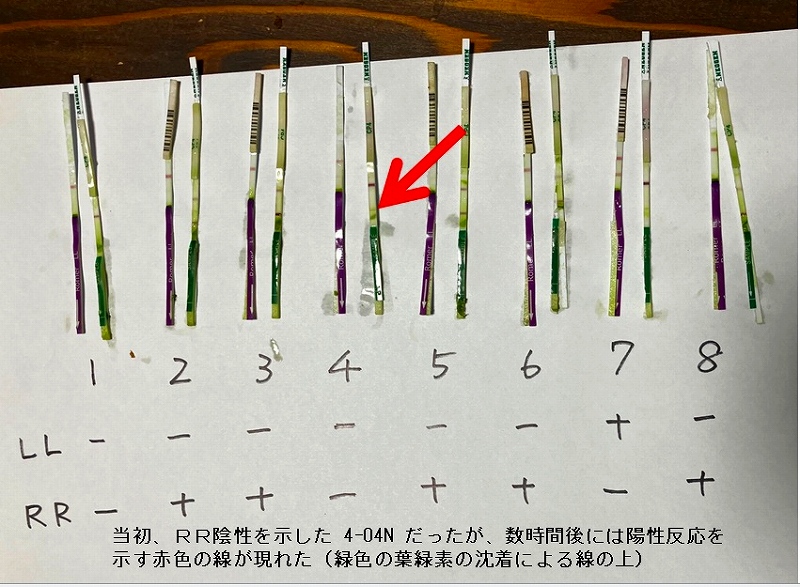 今回、RR判定に使用した、Neogen 社の試験紙は、感度が非常に悪く、正しい判定を示すまでに1時間以上かかってしまいました。 |  |