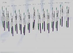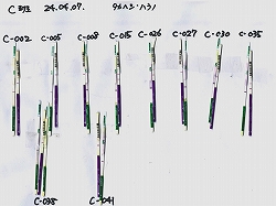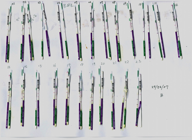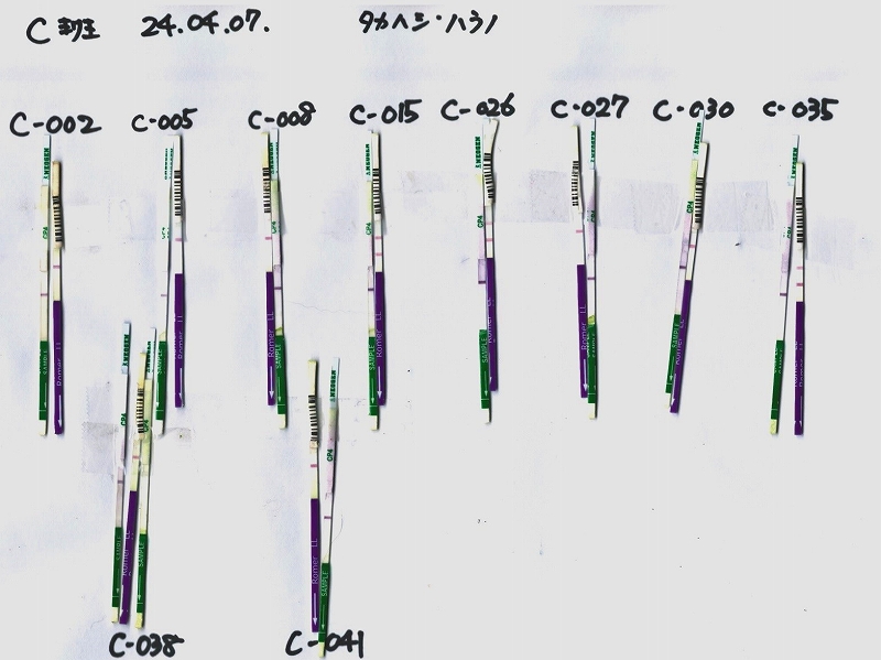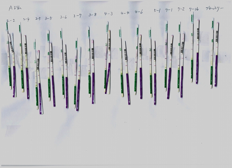 左からA〜C班で使用した試験紙の標本(RR試験紙の感度が良くないため、時間をおいて再確認するのに有効な方法)
