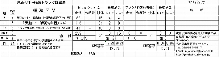 遺伝子操作食品を考える中部の会では、三重県松阪市の製油会社から輸送トラックの駐車場までの約12Kmの区間で、GМナタネの自主調査と抜取を行いました。この区間の調査は、去る3月17日にも行っていますが、状況をさらに把握するため、今回、追跡調査を行いました。