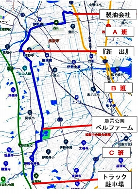当日は、前回と同様、同区間を、左の地図のように3グループ(4〜5名、うち1名はドライバー)に分担して行いました。